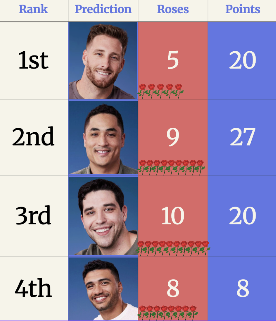 Once the final rose is handed out by Taylor, the winner of Final Four Roses will be the person with the most total points.
